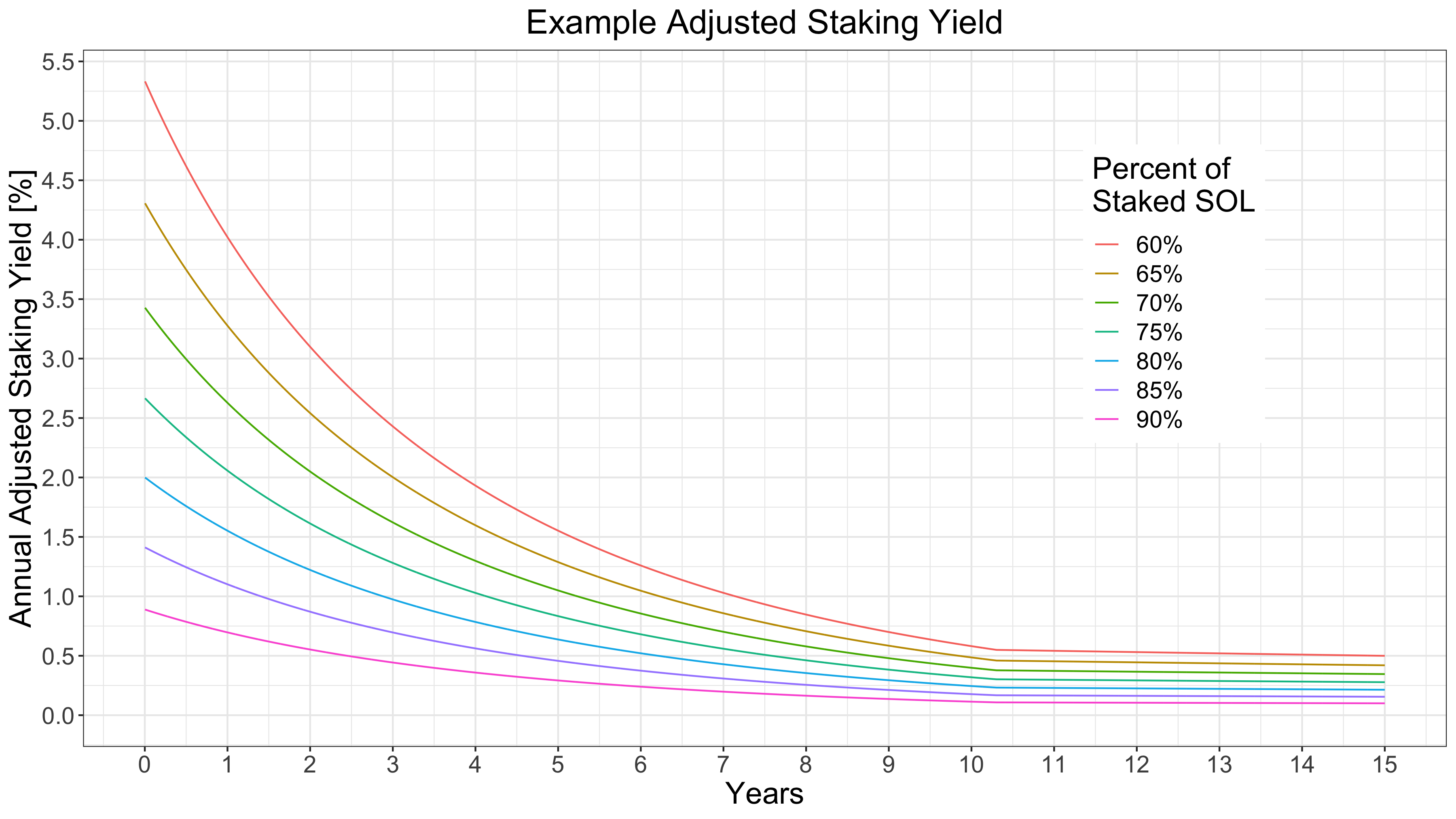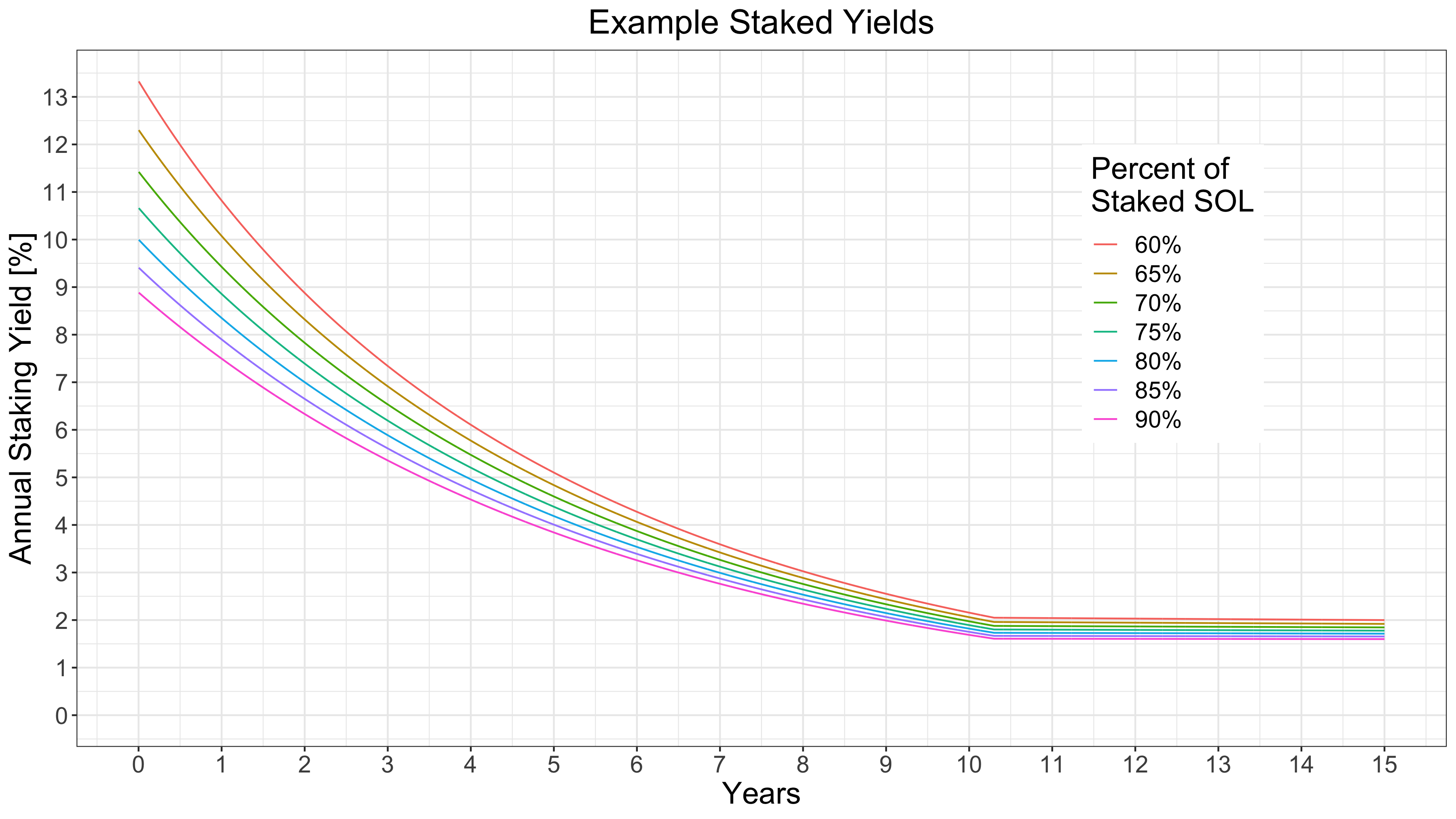 Again, the above shows an example Staked Yield that a staker might expect over time on the Solana network with the Inflation Schedule as specified. This is an idealized Staked Yield as it neglects validator uptime impact on rewards, validator commissions, potential yield throttling and potential slashing incidents. It additionally ignores that % of Staked SOL is dynamic by design - the economic incentives set up by this Inflation Schedule.