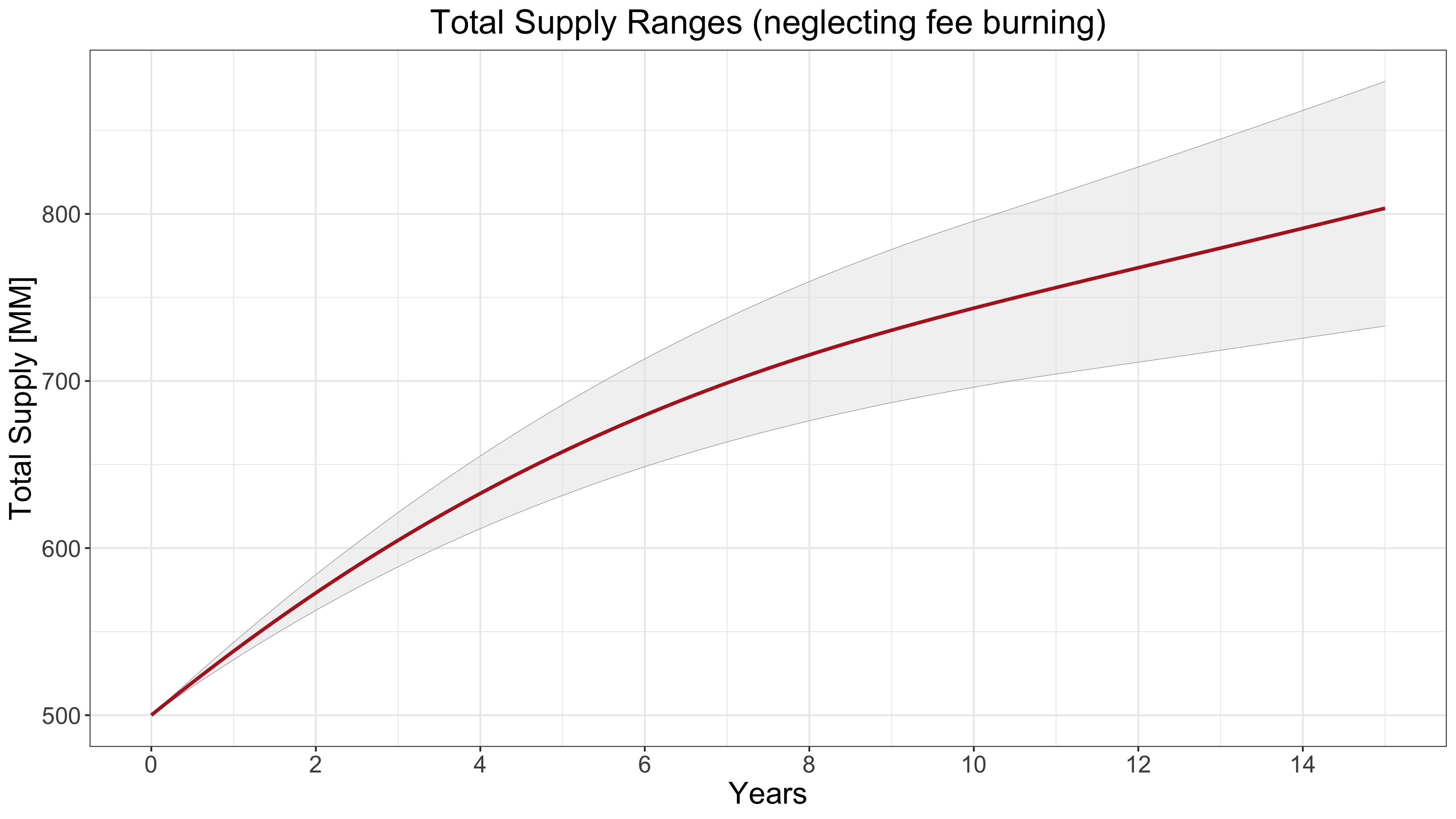 In the above graph, the average values of the range are identified to illustrate the contribution of each parameter. From these simulated Inflation Schedules, we can also project ranges for token issuance over time.